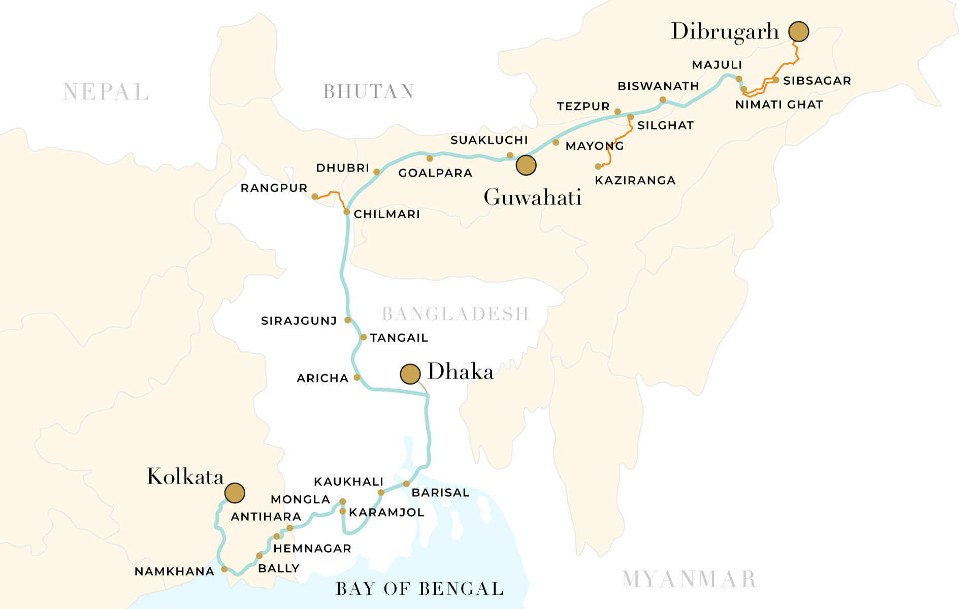 Follow the Ganges river’s course upstream from the Hooghly in Kolkata through several tributaries to reach the holy city of Varanasi….